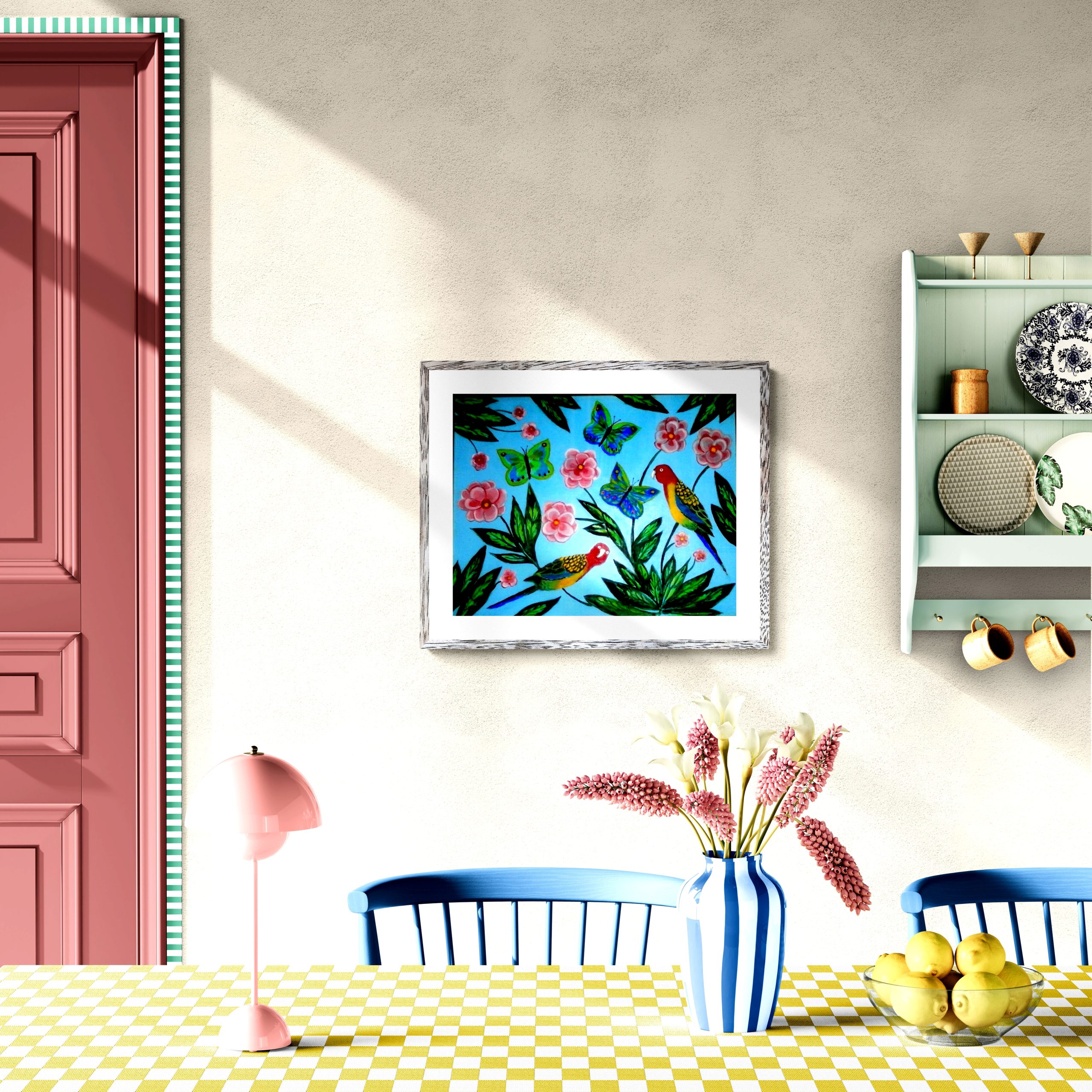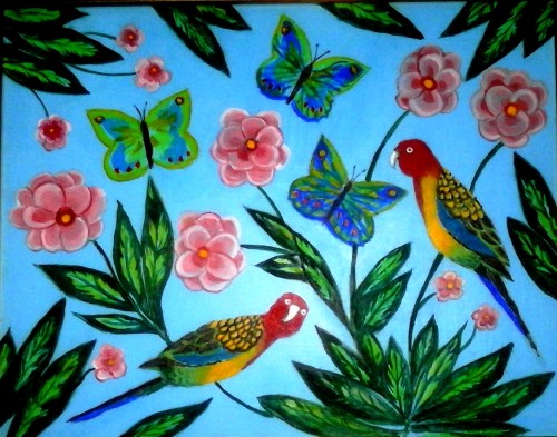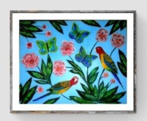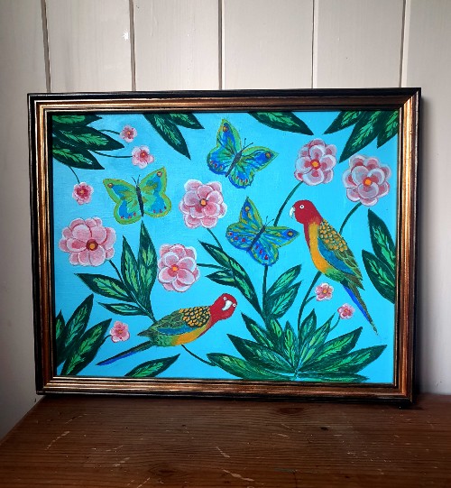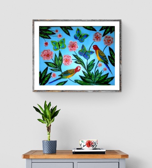 Birds, butterflies, and flowers, fine art print is a reproduction of an original oil painting by the artist Ruth ( Cookie) White. The prints are available in size A4- which measures 210mm x 297mm ( 21x30cm) and will fit any standard A4 frame (9.5×13″). The print is printed on to 300gsm silk card) . For the A3 size the paper used is Superior ultra giclee paper 250gsm.The prints are supplied unframed.