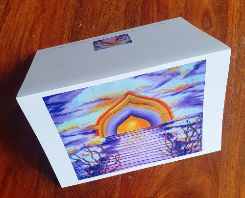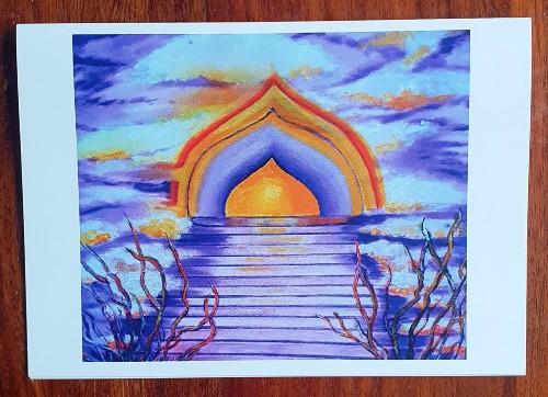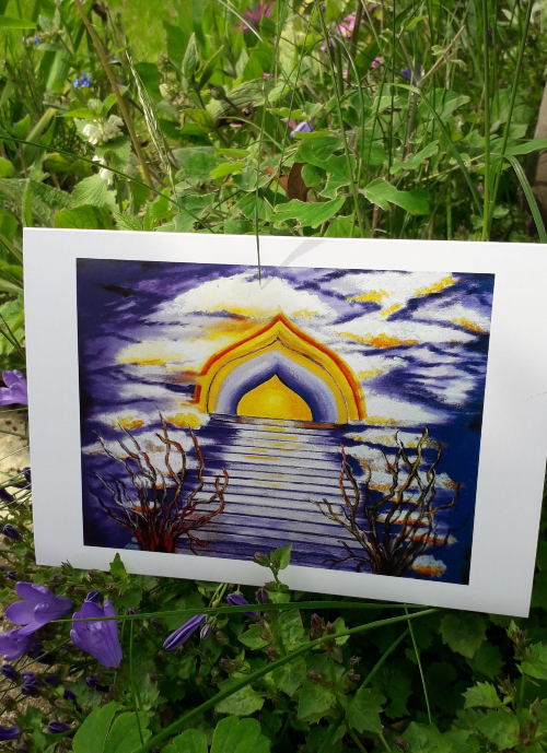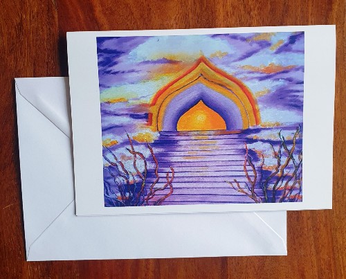 A stairway to Heaven describes ” Heavens Gate” sympathy condolence card. Visions of an archway glowing with colour with steps leading to a better world. The card can also be sent to someone just in need of some sympathy, not necessarily a bereavement, but a friendly gesture to give support in perhaps difficult times.From a painting by the artist Ruth ( Cookie) White.