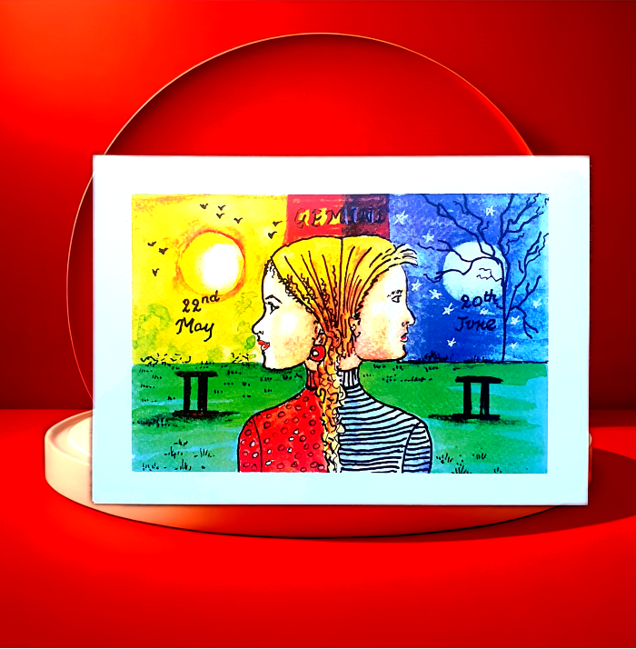For Gemini, diversity is the key, and their duality is shown in the Gemini birthday card, with the scene focused on different horizons and moods. For those born between May 22nd and June 22nd, this Gemini birthday card is a very different way to remember their birthday, and will get them thinking!!