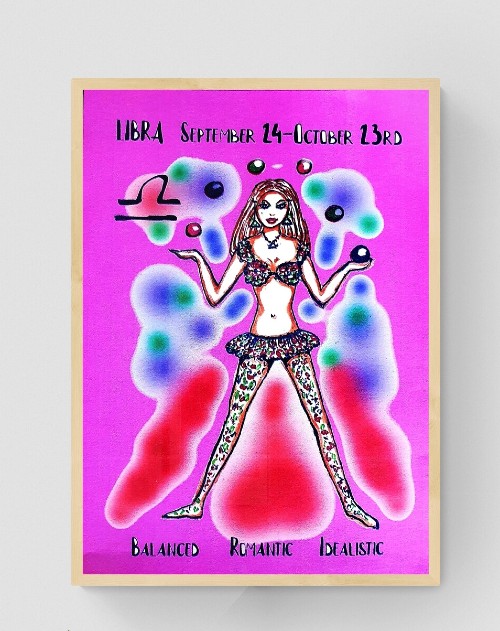 Libra birthday print depicts the artist’s interpretation of ‘balance’- not the usual ‘Scales of Justice’ ( which is very much misused nowadays!) but the simple act of balancing / life/ work/ family/ friends/ leisure/- various ‘hats’ we all wear, represented by juggling coloured balls in the air.