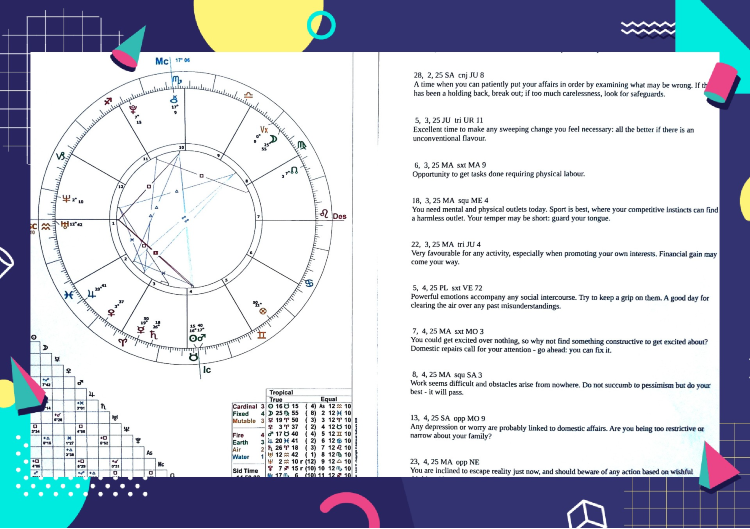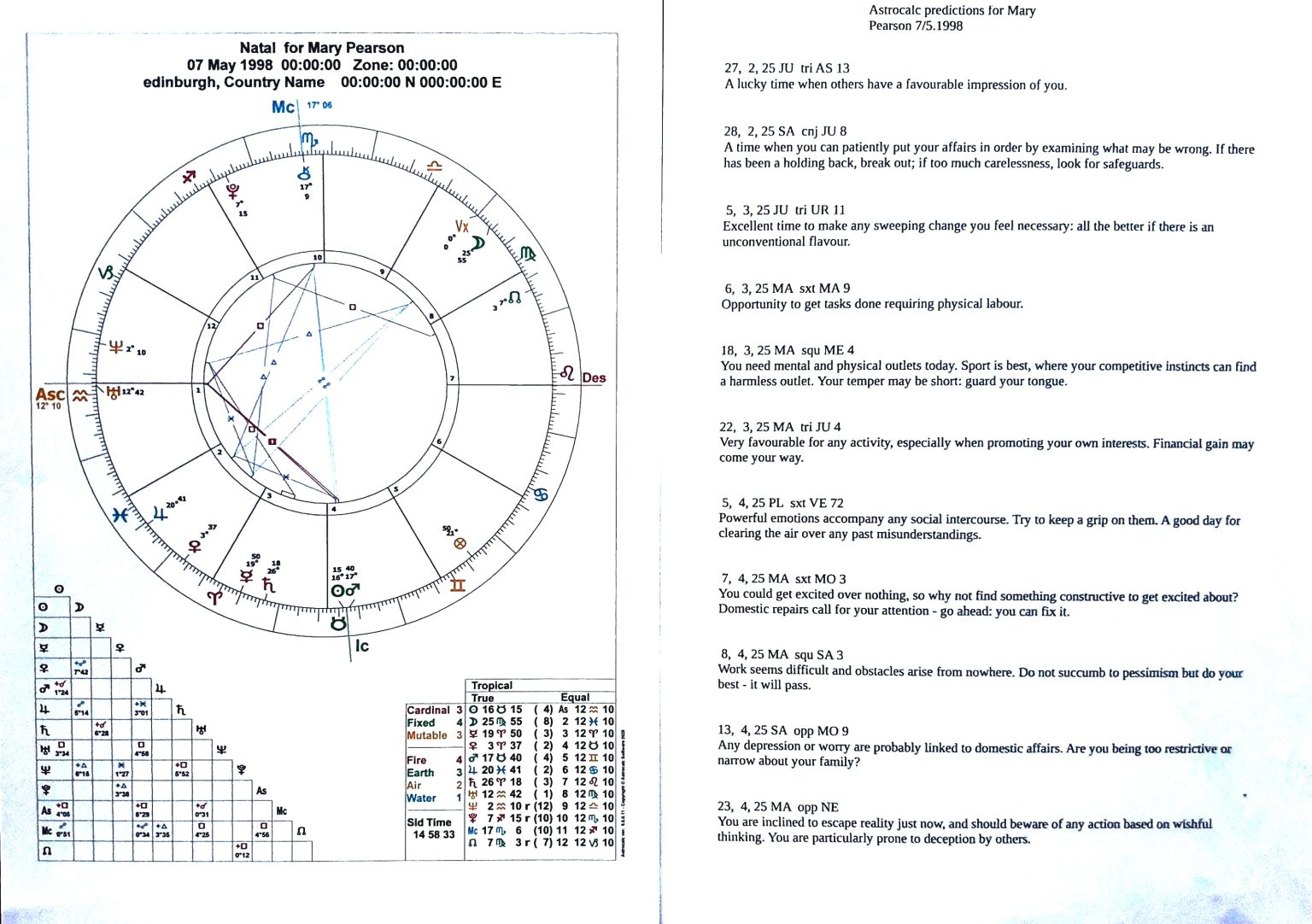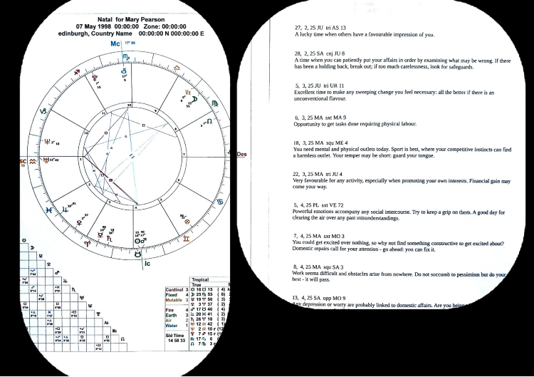 Your own personal horoscope chart drawn up for you when you give your birth place/ time/ and date/country.